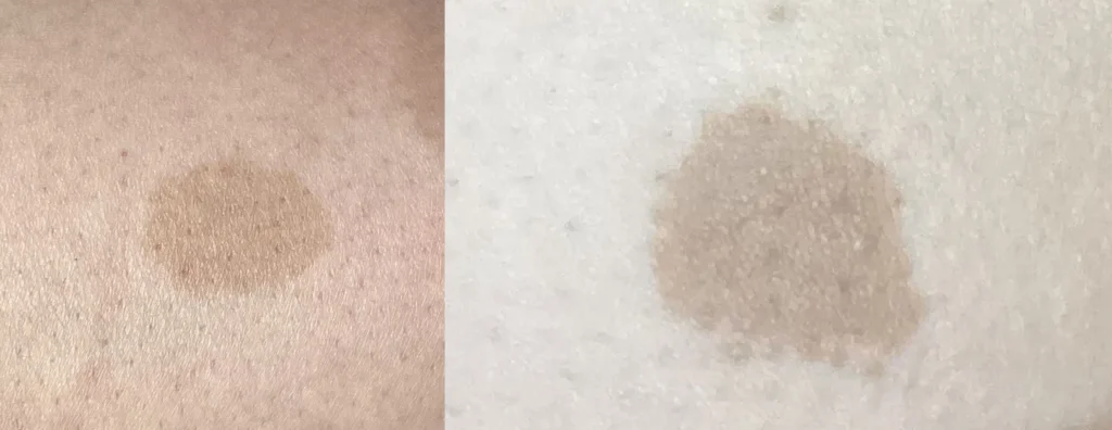 扁平母斑は基本的には診断が簡単ですが、小さいお子さんでは生まれつきのホクロ(先天性色素性母斑)と見極めることが難しいことがあります。扁平母斑では均一な色をしていますが、ホクロでは色の濃淡があるのが特徴です。成長に従って診断できることや、ダーマスコピーを用いて診断していきます。
