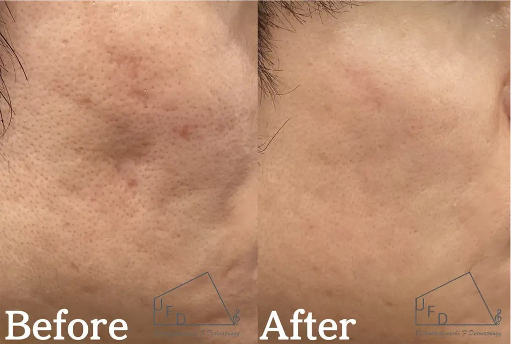 他院でダーマペンなど治療するも改善なく当院受診されました。まずはサブシジョンを1回行い、さらに両頬とこめかみのニキビ跡と毛穴にジュベルック注射を1回行い、1ヶ月後の写真です。ニキビ跡が浅くなり、毛穴も小さくなっています。