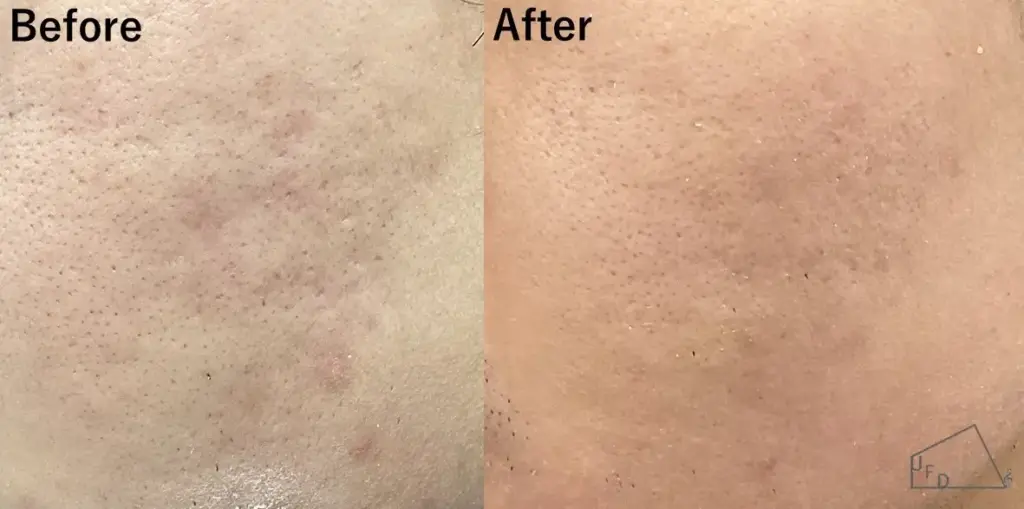 両頬のニキビ跡に対してポテンツァを2回行い、その後サブシジョンを1回行った方です。ニキビ跡がかなりよくなっています。