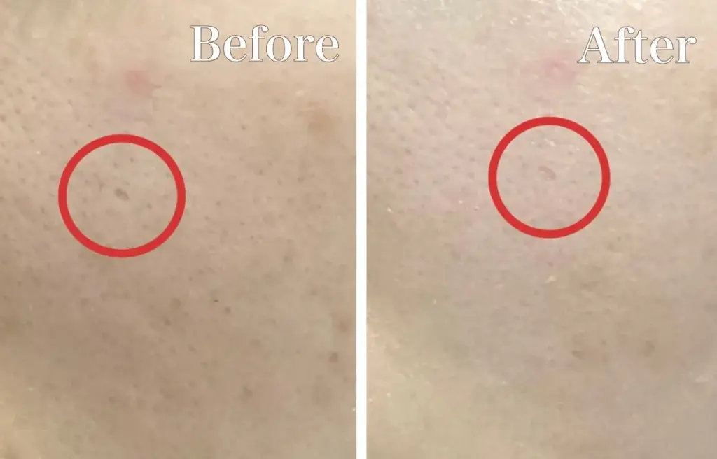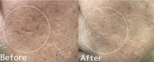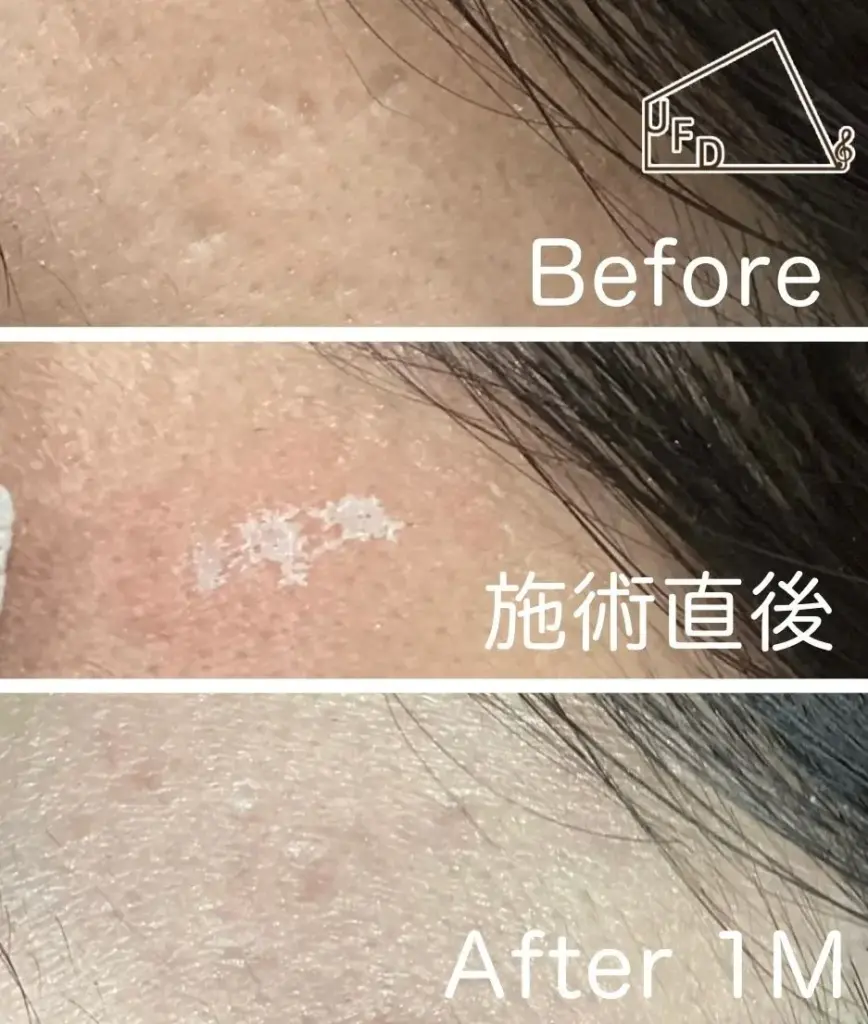 ニキビ跡をTCAクロスで1回治療しました。施術直後はフロスティングで少し白くなります。1回施術し、1ヶ月後にはへこみは浅くなり効果を実感頂けました。