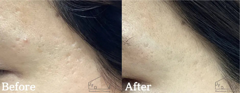 症例4【20歳代女性】左こめかみのニキビ跡(ボックスカー型)